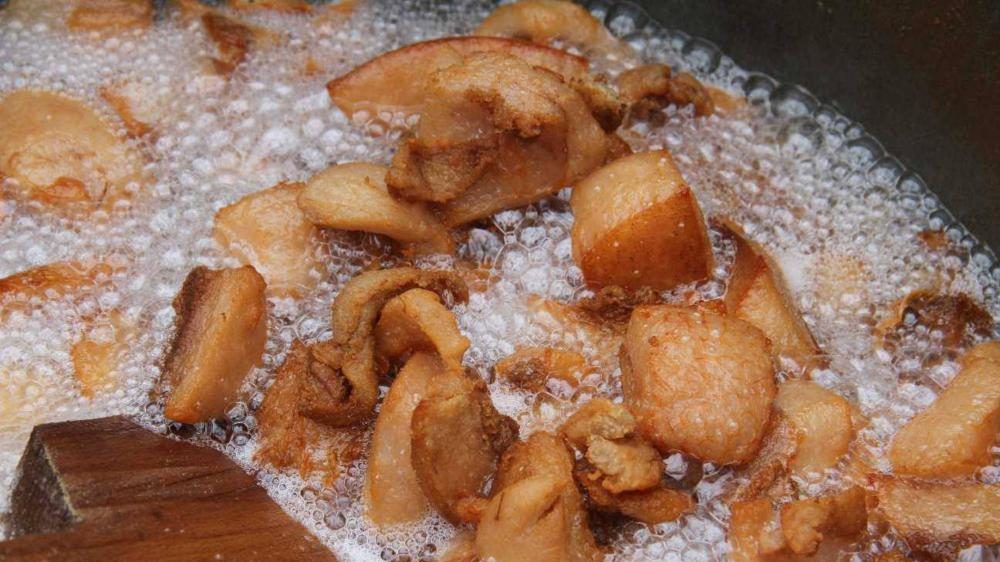 Nagy mennyiségü sertéstepertő készitésé eredményként a finom sült setészsír.